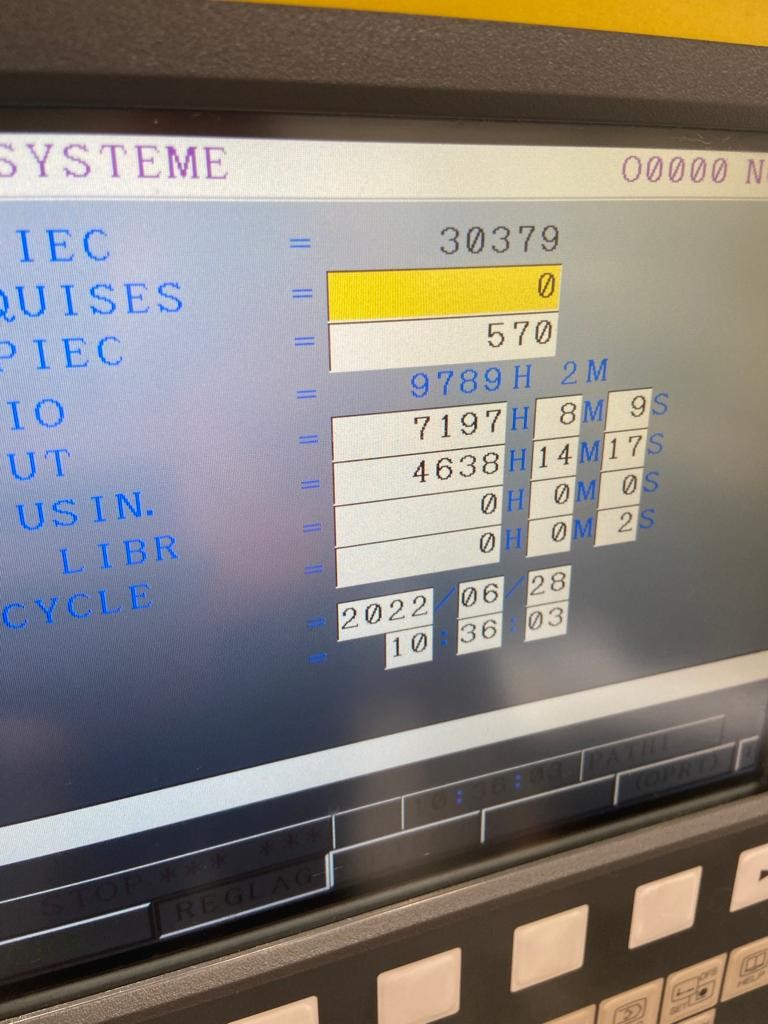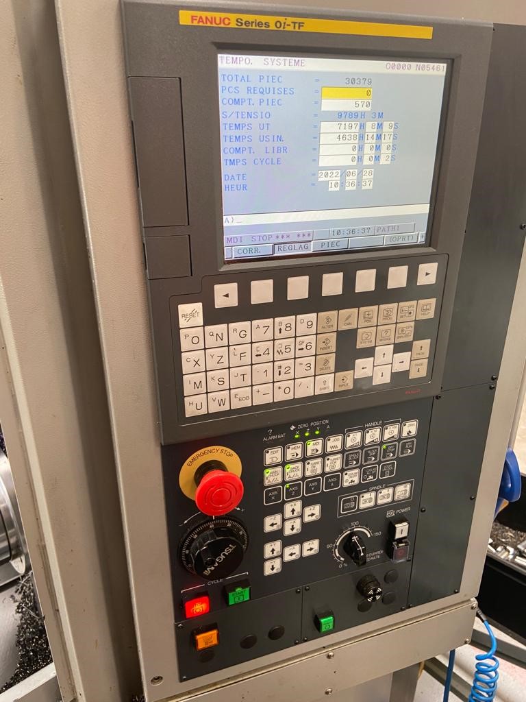 CONTROL FANUC Oi-TF with manual guide MAXIMUM CUTTING DIAMETER 280 mm BAR CAPACITY 65 mm DISTANCE BETWEEN SPINDLES 400 mm SPINDLE MOTOR POWER 7,5/11KW SPINDLE NOSE A2-6 SPINDLE SPEED 4500 rpm SUB SPINDLE BORE 59 mm SUB SPINDLE MAX SPEED 4500 rpm TURRET POSITIONS 12 STATION TOOL SIZE 25 X 25 mm MILLING RPM 5000 RAPID FEEDRATES XZYA: 24X27X12X30 m/min C AXIS 0.001 DEGREE X AXIS TRAVEL 221 mm Y AXIS TRAVEL +50/-50 mm Z AXIS TRAVEL 400 mm MACHINE DIMENSIONS 2470 X 1850 X 1930 mm MACHINE WEIGHT 5600 kg Chip convoyer Tool probe Tools With Bar feeder LNS QLS80 S2 Cutting time 4638 Hours Technical description without guarantee, only as an indication.